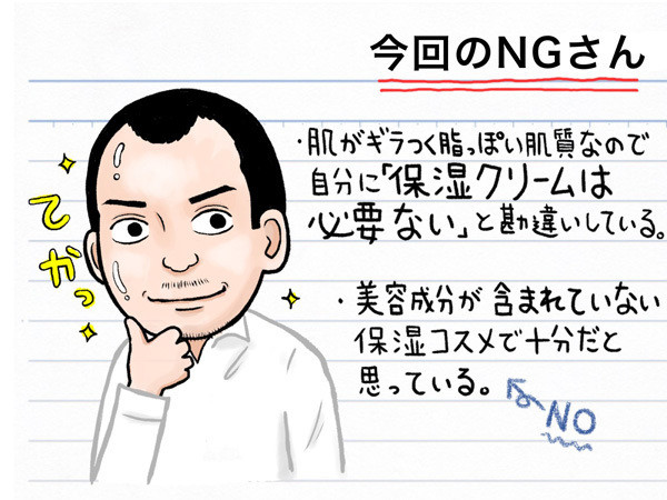 「あれっ、またテカテカしている」と気付いた40男は、その原因を誤解している可能性が。ギラつくおでこや小鼻は、度を越えた乾燥によるSOSのサインだからです。脂っぽい肌質の人に限って、「保湿クリームは必要ない」と考えがちですが、それは大きな勘違いと言えます。