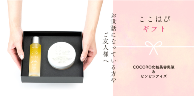 ギフトとして選んでいただくことも多い、オールインワンCOCORO化粧美容乳液と目元・口元専用ゲルパックピンピンアイズのセット。オリジナルギフトボックスをご用意いたしました。漆黒の上質な箱に入れて、大切な方へお届けいたします。
