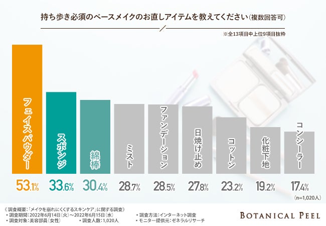 また、「持ち歩き必須のベースメイクのお直しアイテムを教えてください(複数回答可)」と質問したところ、『フェイスパウダー(53.1%)』と回答した方が最も多く、次いで『スポンジ(33.6%)』『綿棒(30.4%)』と続きました。