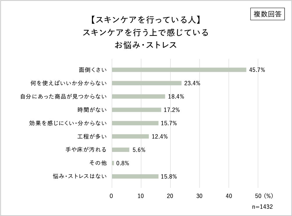 - スキンケアへの悩み・ストレス1位「面倒くさい」2位「何を使えばいいか分からない」