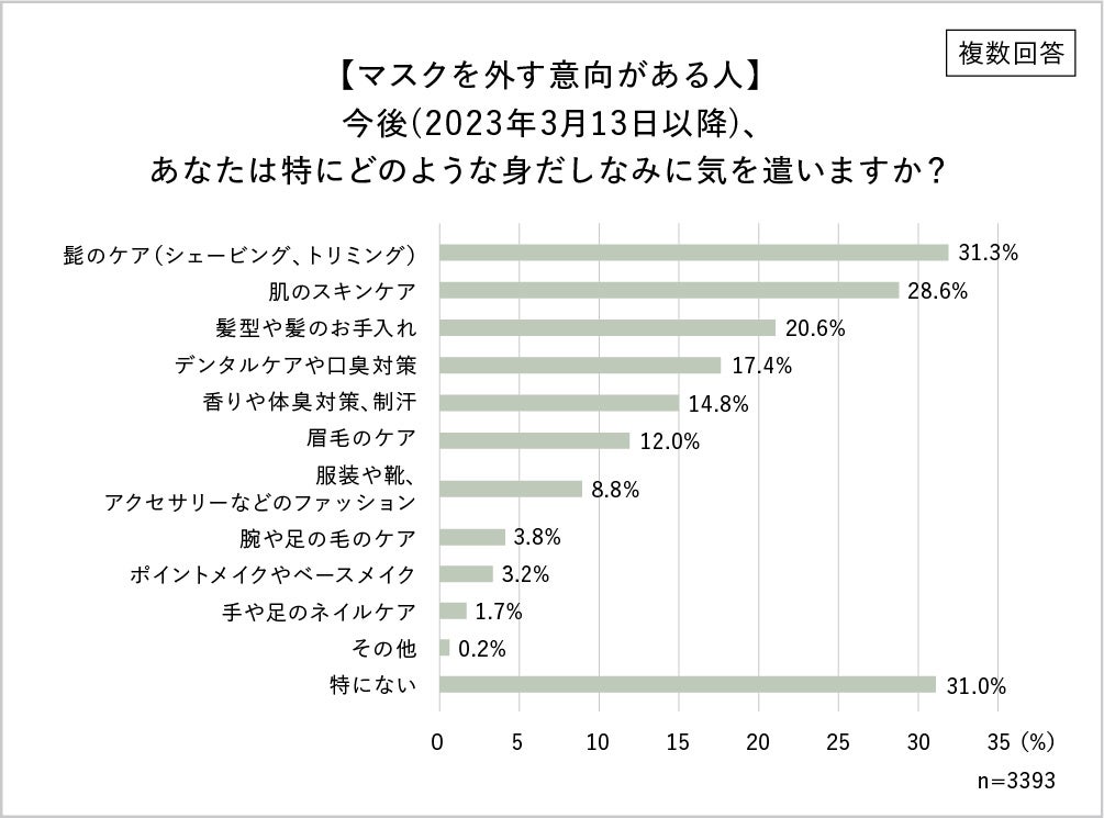 2023年3月13日から、マスクの着用が個人の判断に委ねられるようになりました。この発表を受け、3月13日からマスクについてどのように行動する予定か質問したところ、約4割が「外す・外す意向がある(37.1%)」と回答。さらに、外す・外す意向があると回答した人は、髭・肌・髪・口といった、顔周りの身だしなみに気を遣う意向もあることが分かりました。マスクを外すことで、顔周りへの意識が高まることが予想されます。