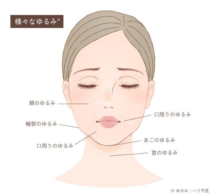 お肌へは、紫外線などの目に見えないダメージが日々、蓄積。加齢に伴い、肌の水分や油分が減少し、全体的にハリがなくなっていきます。また、引き締める力が弱くなるので肌が徐々にゆるみ、あご・口・首周りなど、印象が気になる部分が増えてきます。そんなもたつきの気になるお肌には、ハリと弾力でアプローチ!