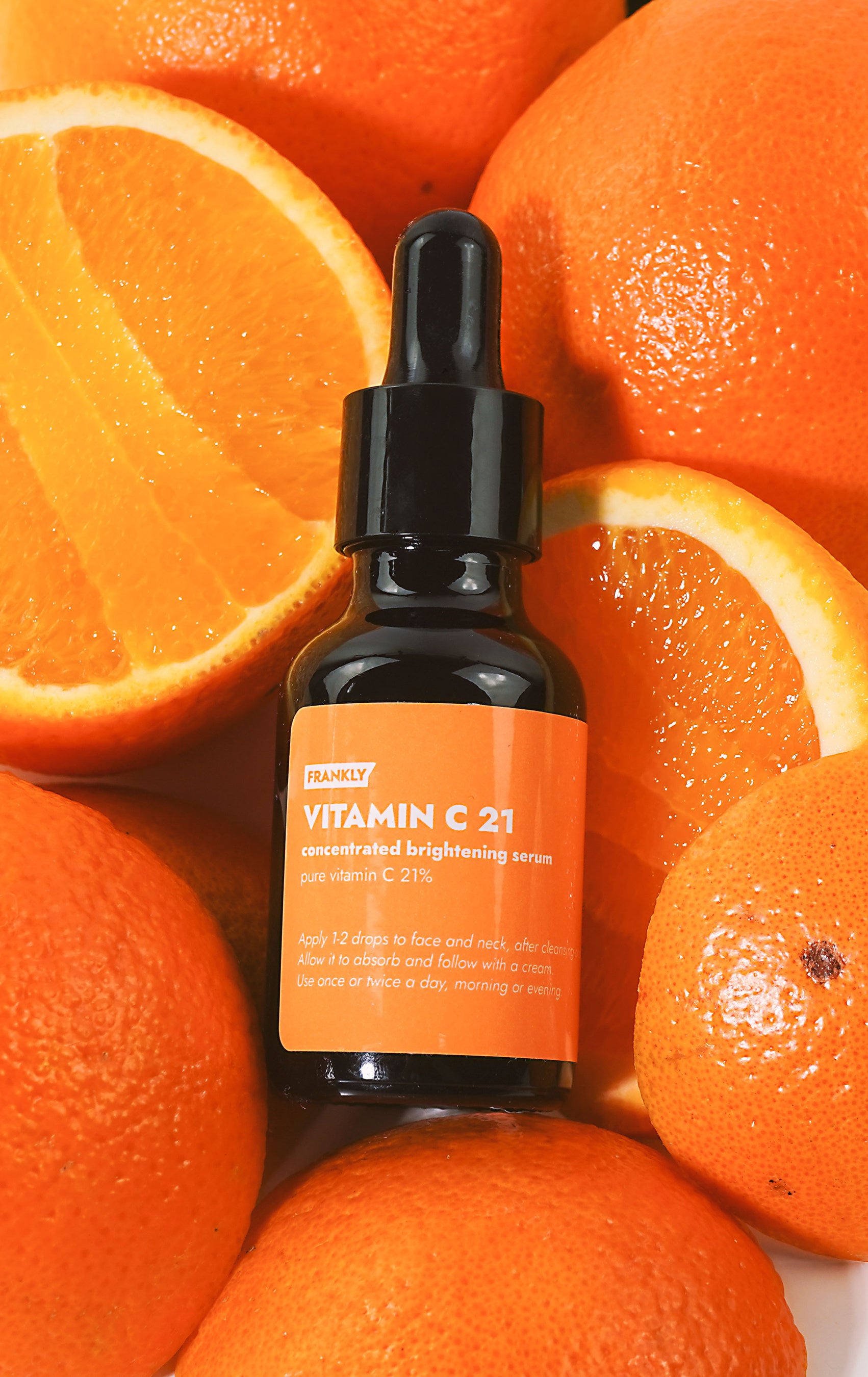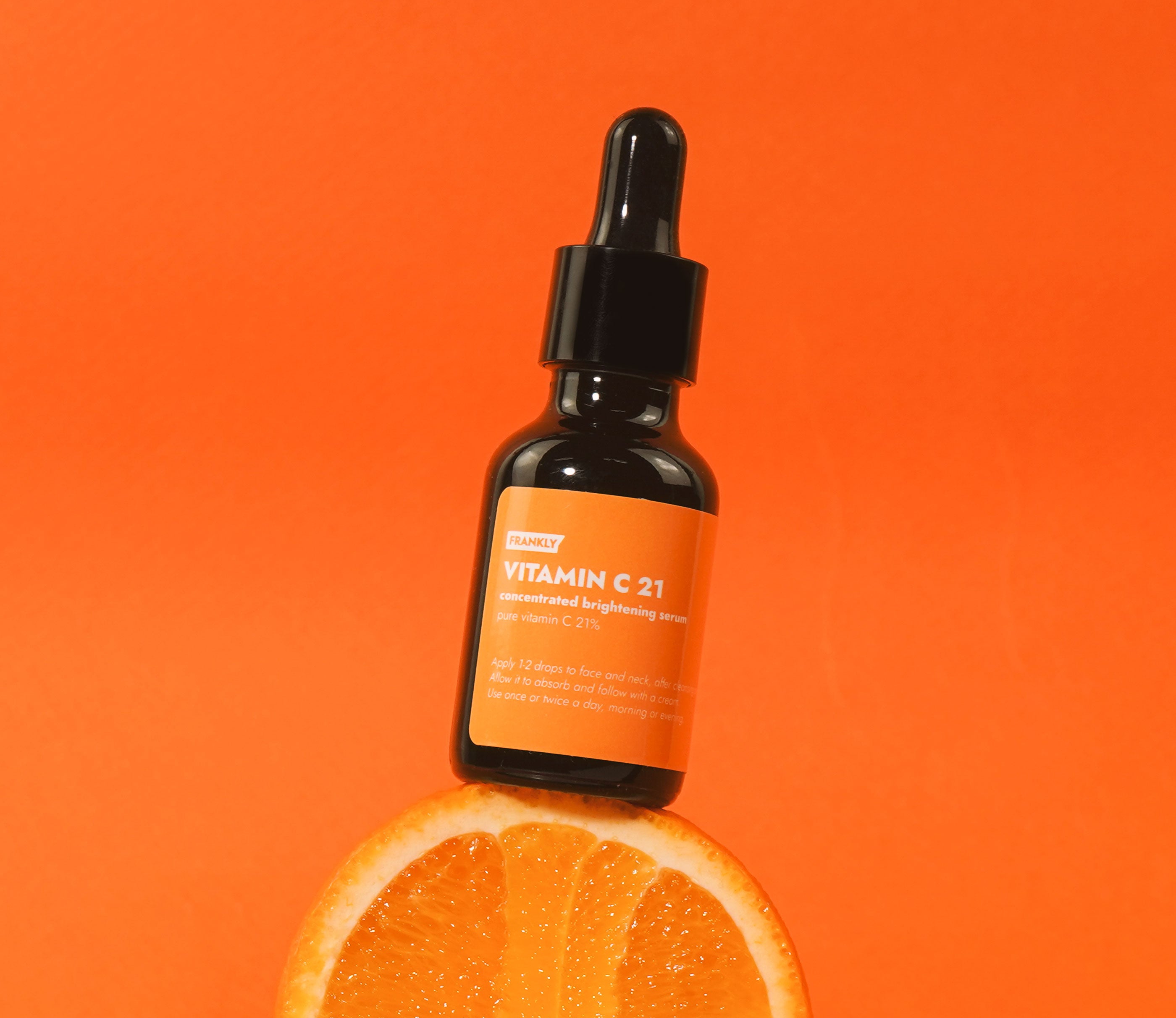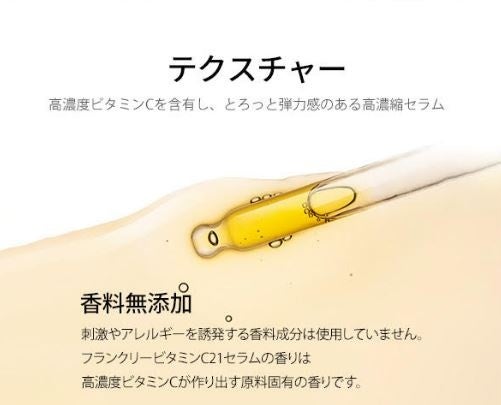 FRANKLY(フランクリー)のビタミンCセラムは、イギリス産純粋ビタミンCを21%配合した濃厚美 容液です。ビタミンC高含量テクスチャー特有のべたべたした使用感を解決し、すっきりした使い心 地に仕上げました。