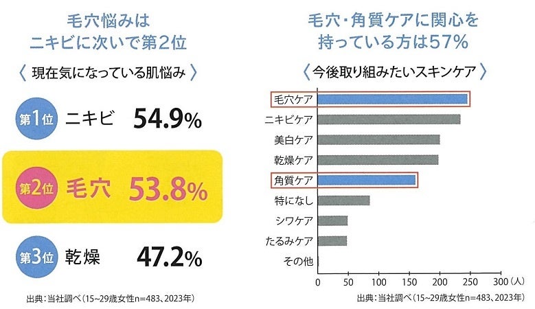当社の調査(2023年)によると、Z世代女性の50%以上の方が「毛穴」悩みを抱え、「毛穴・角質ケア」に関心を高く持っています。また、「角質ケア」が「毛穴ケア」に繋がると考えている方が多い一方で、「角質ケア」のイメージとして、“手間がかかる”、“面倒である”という懸念もあることが分かりました。価格的にも手軽な商品が少ない中で、Z世代の女性にとって「角質ケア」のハードルが高くなってしまっていると考えられます。