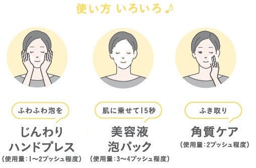 また、ふわふわ泡を「ハンドプレス」や、泡を肌にのせて「美容液泡パック」、「ふきとり角質ケア」など、様々な使い方ができるのも特長です。