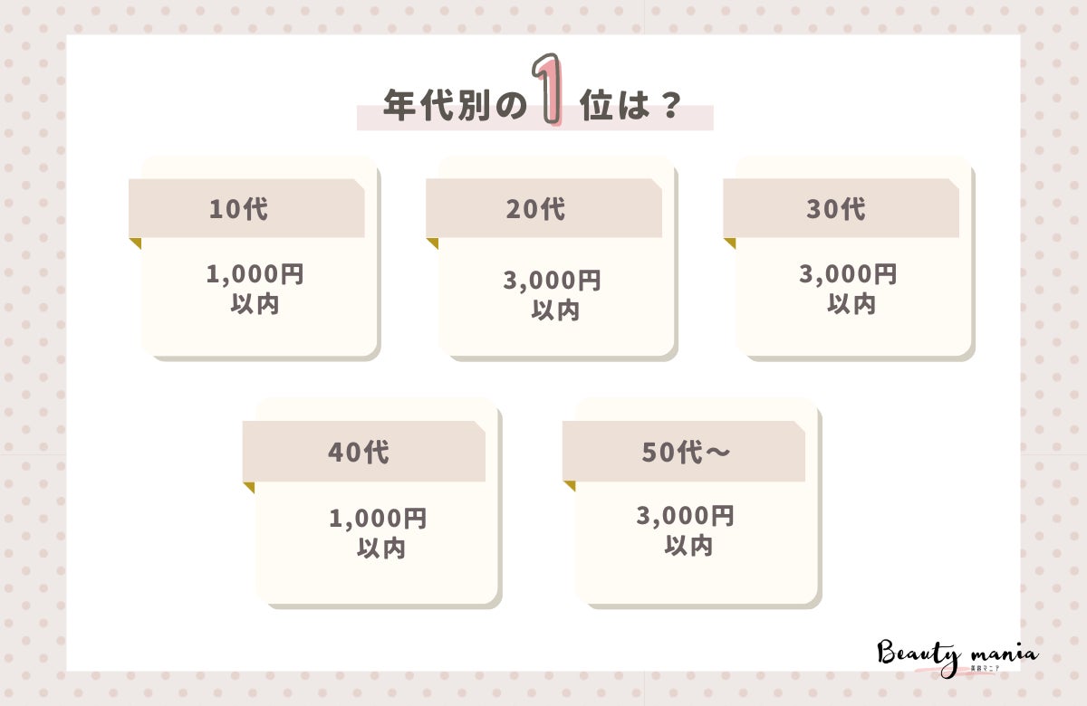 ・化粧水と乳液ぐらいしか使用しないし、1本購入すると3ヶ月はもつので平均だと1,000以内になるからです。(50代〜)