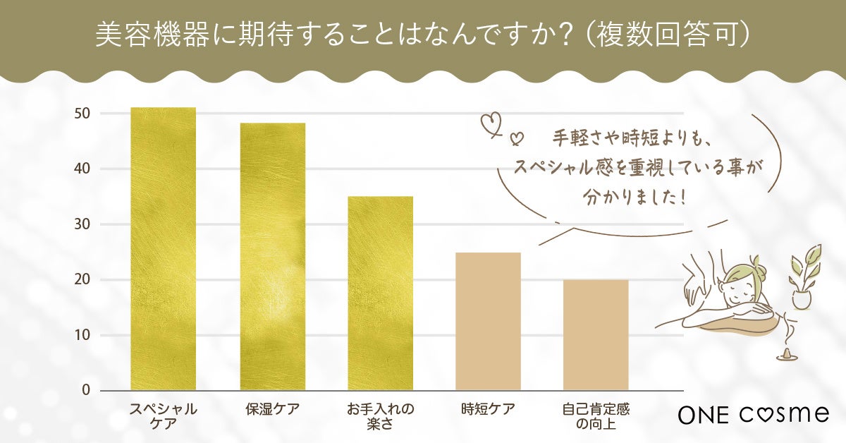 また、美容機器には、時短や手軽さよりスペシャルケアとして保湿ができるかを重要視していることがわかりました。