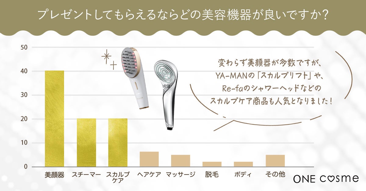 その中でも最も特徴的だったのが、YA-MANの「スカルプリフト」や、Re-faのシャワーヘッドなどのスカルプケア商品をプレゼントでもらいたい商品として挙げた人が多いという点。