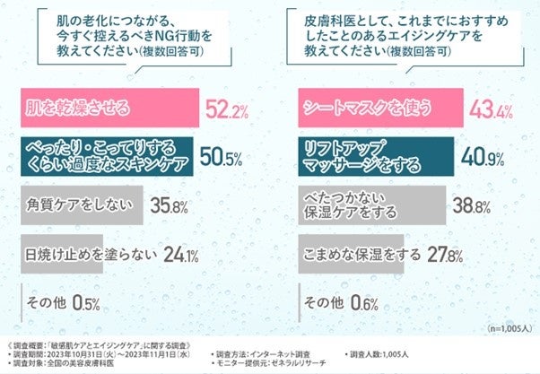 また、20代からエイジングケア(※1)を行った方がよいと思う美容皮膚科医が多く、肌を乾燥させることや、過度なスキンケアは肌の老化につながるので控えた方がよいことがわかりました。