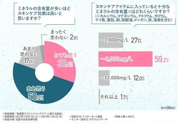 スキンケアアイテムに入っていると十分なミネラルの含有量※(※カルシウム、マグネシウム、ナトリウム、カリウム、ケイ素、亜鉛、銅、硫酸塩、マンガン、鉄、塩素を含む)に関しては、『~6,000mg/L(59.2%)』が最も多い結果となっています。