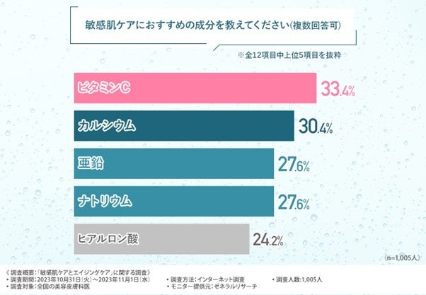 敏感肌ケアにおすすめの成分は、『ビタミンC(33.4%)』が最も多く、次いで『カルシウム(30.4%)』『亜鉛(27.6%)』『ナトリウム(27.6%)』と続きました。