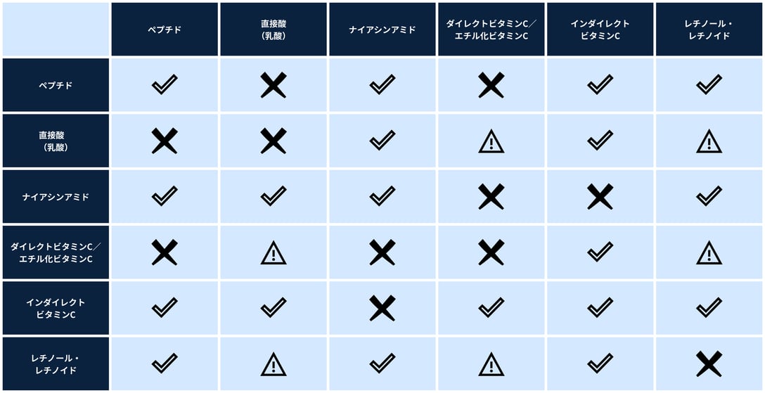スキンケアで組み合わせて使用してもいい成分・避けた方が良い成分のチャート(ブランド資料を元に作成)
