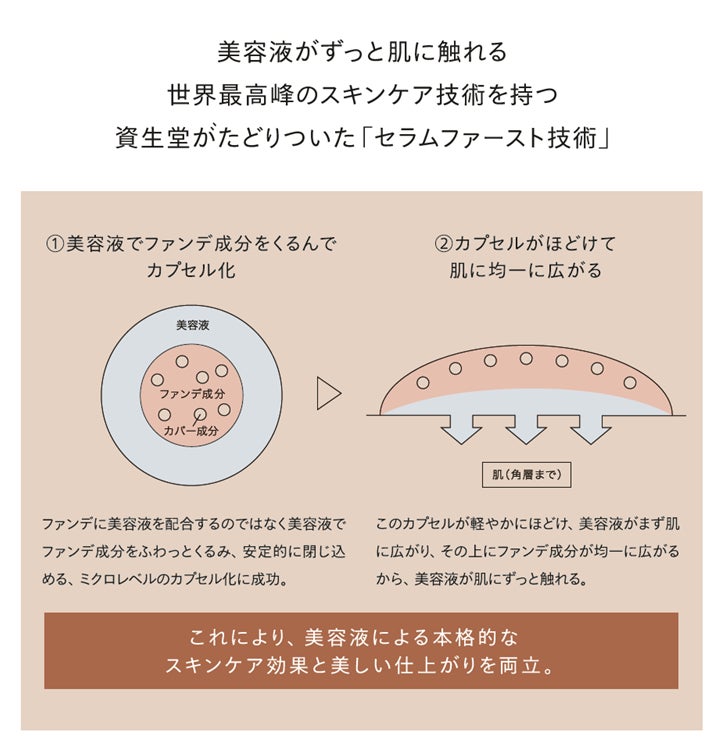 ファンデーションに美容液成分を配合するのではなく、美容液の中にファンデーション成分を閉じ込めるから、つけた瞬間からずっと美容液が肌に触れ続ける、という資生堂独自の「セラムファースト技術」を搭載しています。本技術は現在、「SHISEIDO エッセンス スキングロウ ファンデーション」および「マキアージュ ドラマティックエッセンスリキッド」の2品に搭載されています。